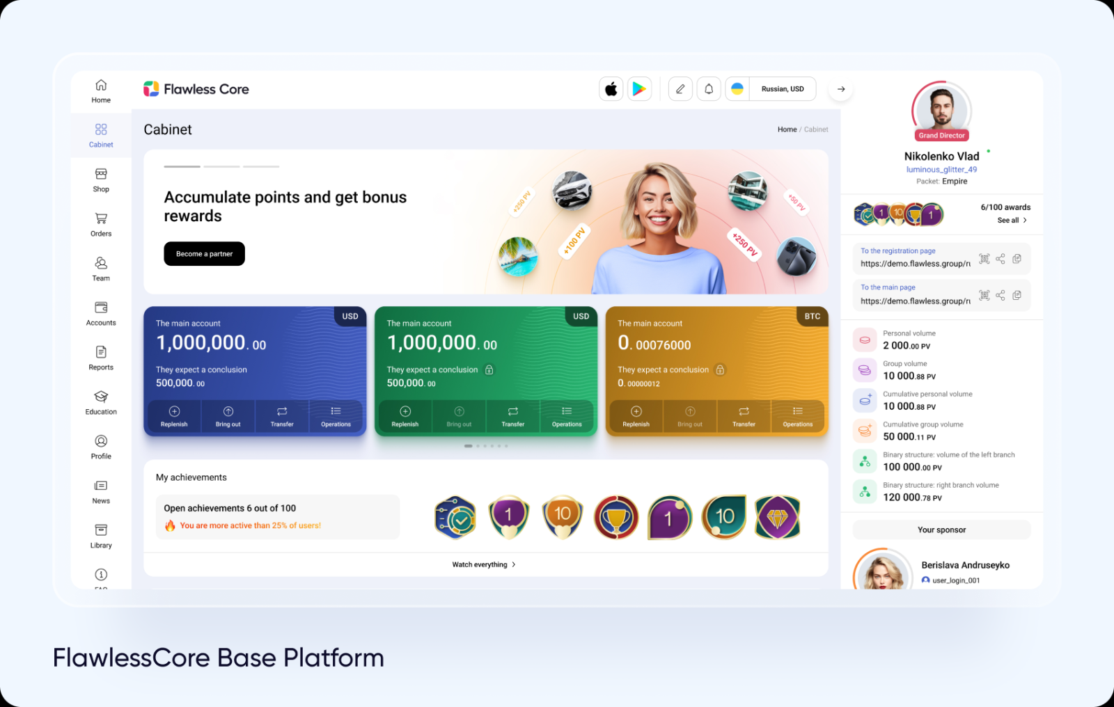 Интернет-магазин с продвинутой системой управления товарами, акциями и быстрым оформлением заказа подходит как для компаний с широким ассортиментом, так и для проектов с одним основным продуктом. Личные кабинеты партнеров содержат всю необходимую информацию: балансы счетов, реферальные ссылки, статистику по бонусам и активности структуры. Это повышает мотивацию дистрибьюторов и укрепляет их доверие к компании.