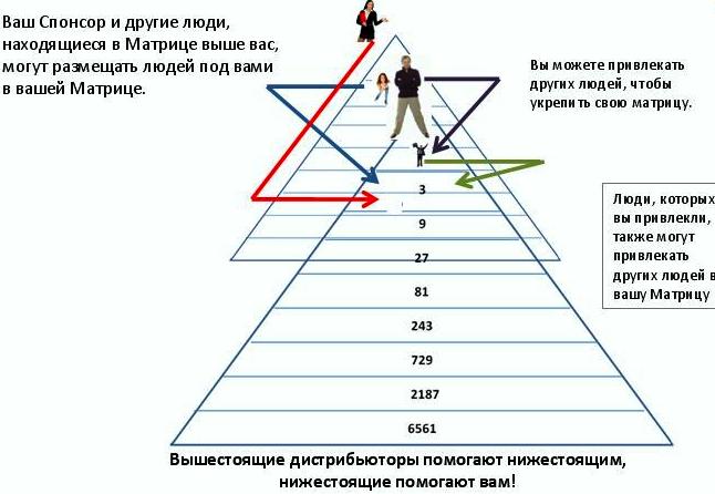 А Матрица как при этом работает? Как уже сказал, под каждым лично приглашенным строится личная структура. Тем не менее, при соблюдении принципа Классики, эта структура строится по матрице-тринару. Ты приглашаешь сколько угодно партнеров, но распределяются они "тройками" - под тобой 3, под каждым из них тоже по 3 и т.д.